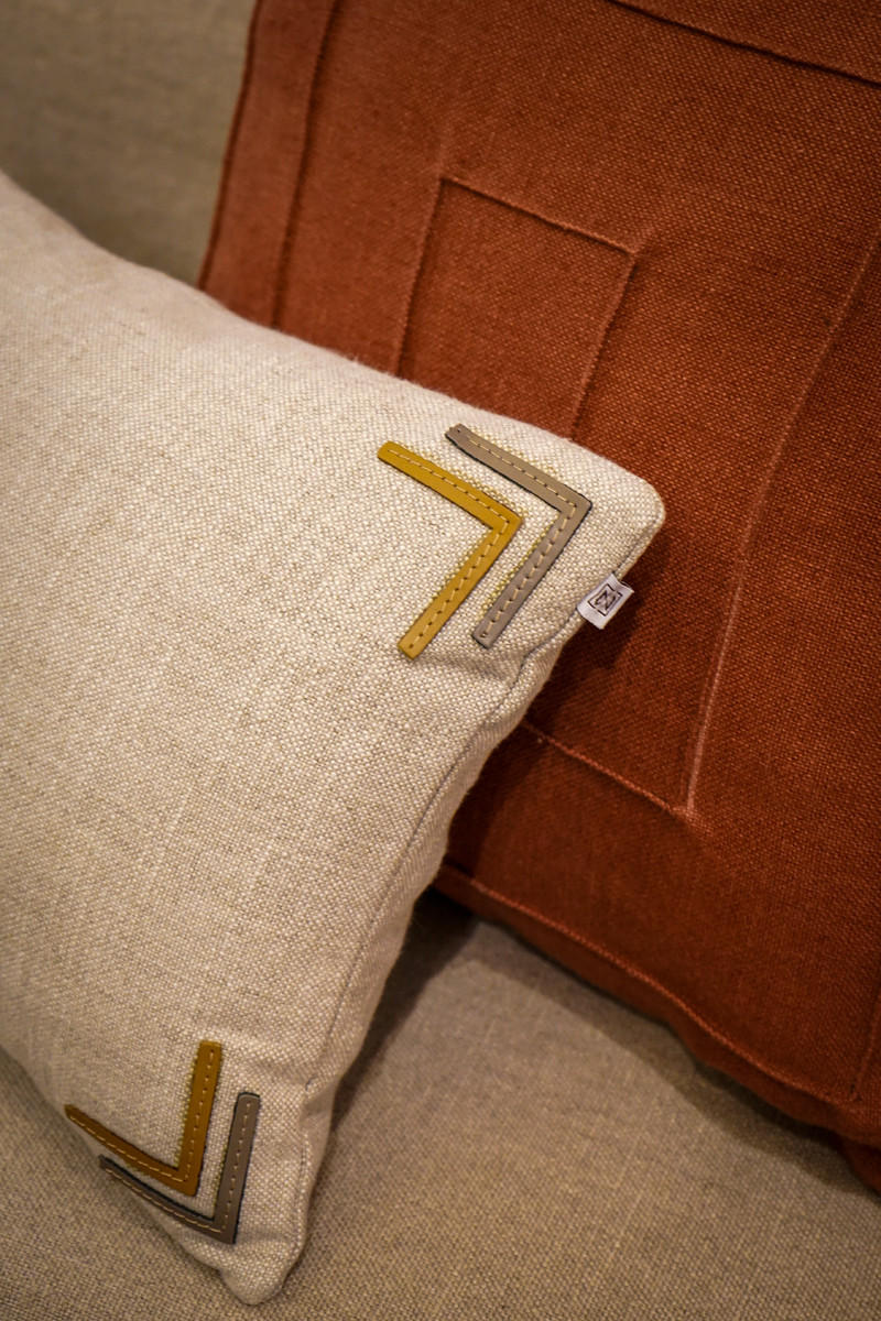 As almofadas da coleção Fractais são composições têxteis que aprofundam o diálogo entre forma, matéria e equilíbrio. Em suas superfícies, o encontro entre o linho e o couro cria contrastes táteis e visuais que evocam a paisagem brasileira — suas texturas brutas e refinadas, seus tons terrosos e vegetais, suas transições sutis entre o orgânico e o racional.