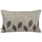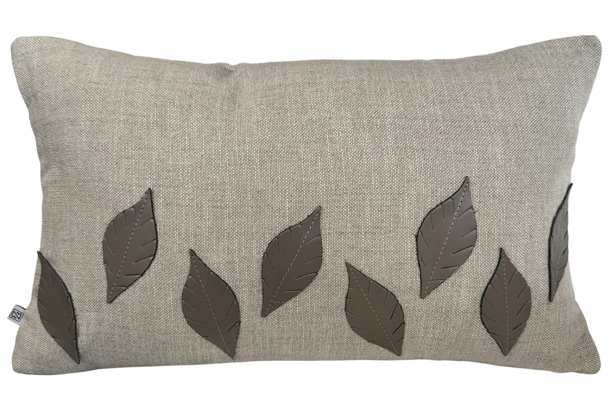Como folhas que caem e se alinham ao acaso sobre o solo, o bordado em couro traz um ritmo leve e natural à almofada. Cada forma carrega a memória de um ciclo, repetida com pequenas variações, como acontece nos fractais que observamos nas paisagens da estação. Uma composição que transmite quietude, passagem do tempo e beleza no detalhe.