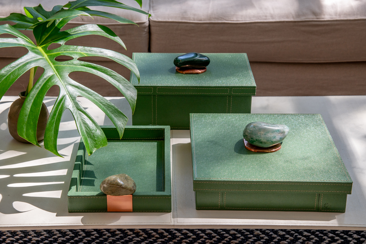 A partir dessa união, as caixas e bandejas revestidas em couro, do Empório Beraldin, recebem apliques de cobre e lindíssimas pedras como piritas, turmalinas negras, ágatas, cristais de quartzo e ametistas, provenientes de minerações do sul de Minas e das Serras Gaúchas.