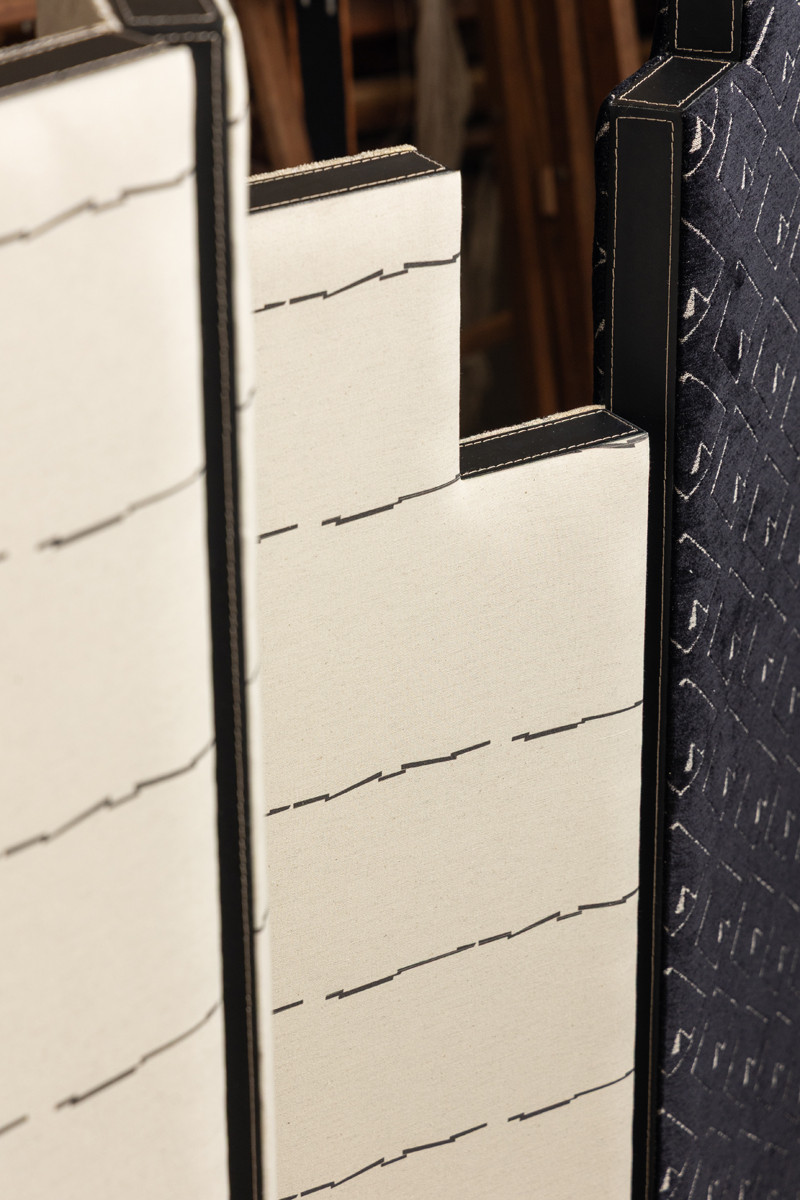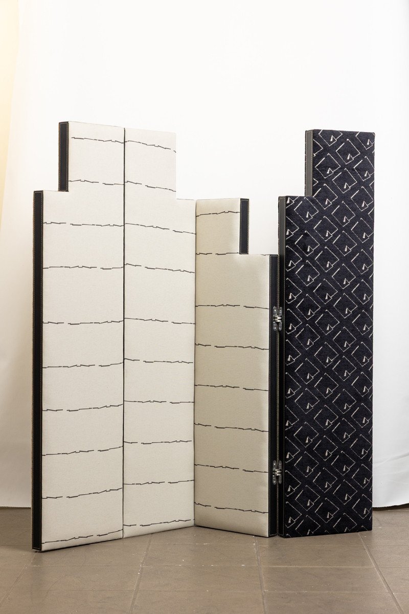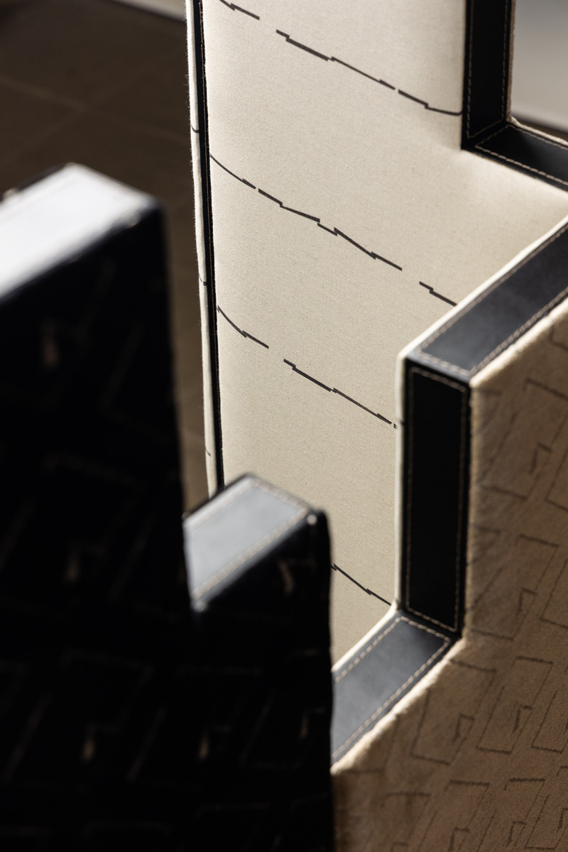 Como autodidata no design, o Art Déco foi sua primeira escola teórica – a geometria lírica em sintonia com o processo industrial a marcaram. Por conta dessa influência, a designer criou uma coleção têxtil que celebra as platibandas (faixas verticais que emolduram a parte superior de um edifício e escondem os telhados) como formas e estudos de repetição.