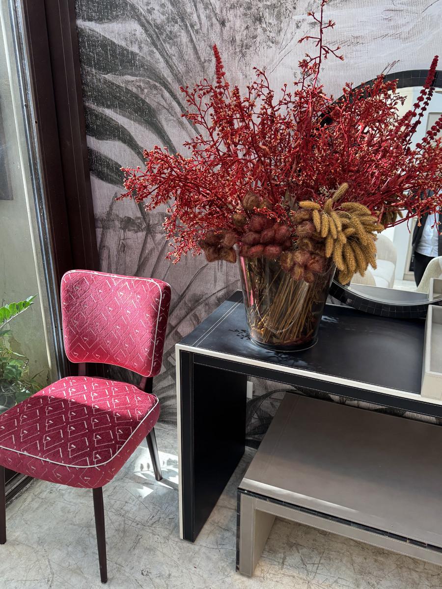 SANDRA ARRUDA mergulha na arquitetura popular do sertão nordestino e na estética do Art Déco brasileiro, criando jacquards que remetem às platibandas das fachadas. A repetição e a cor desenham ritmos que ecoam simetrias da natureza e transformam- se também em lindos tecidos estampados e papéis de parede.