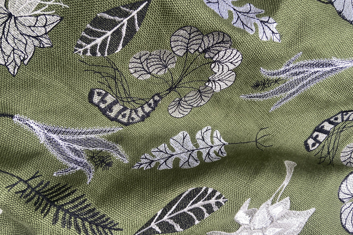 Para a Coleção Biomas de 2022 os bordados de Ronaldo Fraga aparecem no linho Prado verde.